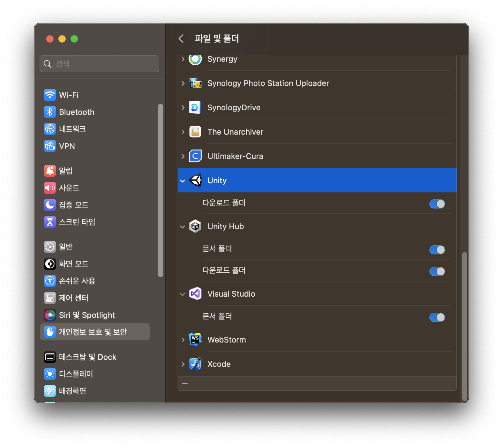 개인정보 보호 및 보안 - 파일 및 폴더에서 Unity와 Unity Hub에 대한 폴더 사용 권한을 활성화
