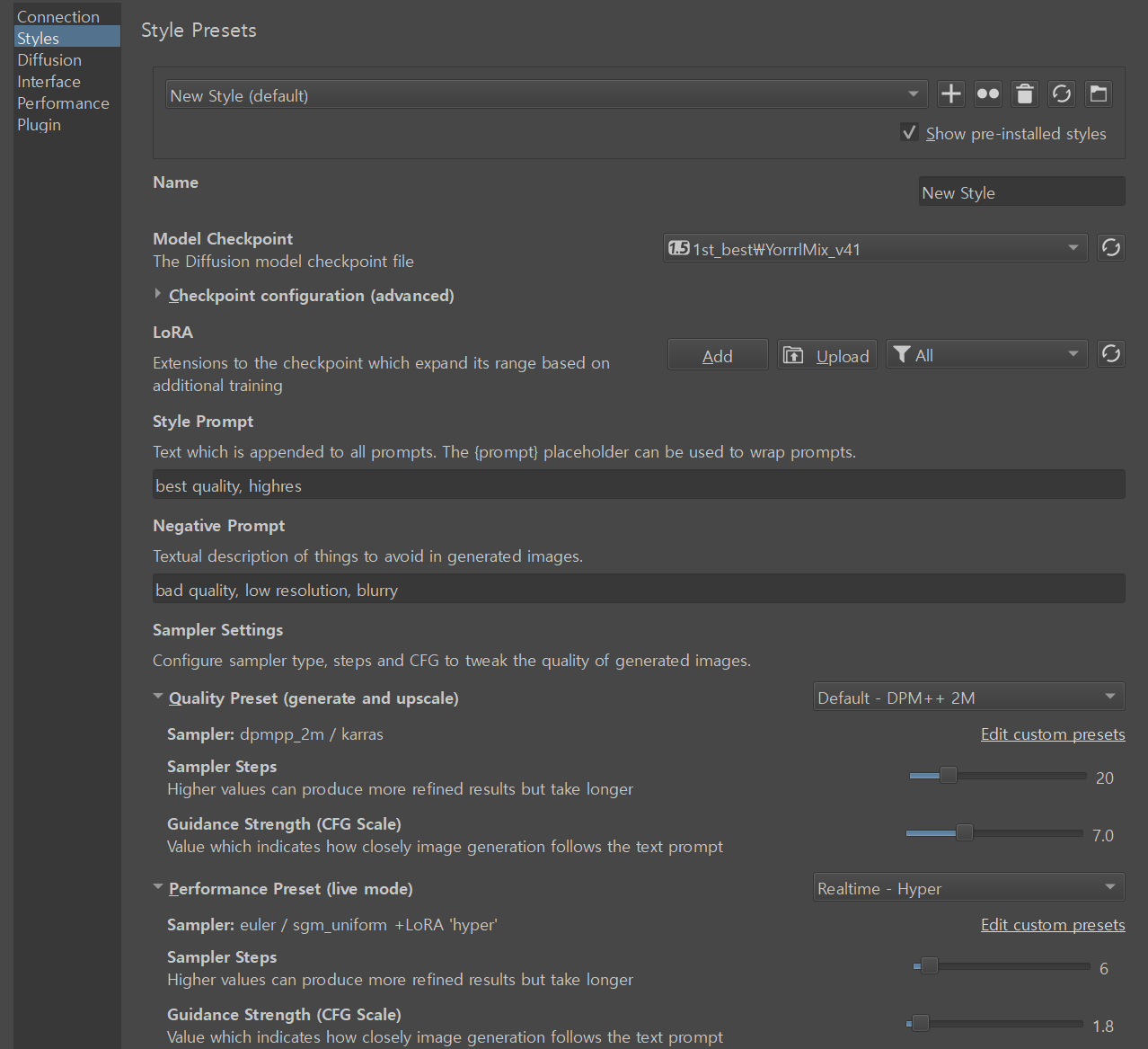 Style에서 사용할 체크포인트, 샘플러 등의 프리셋을 추가할 수 있다.