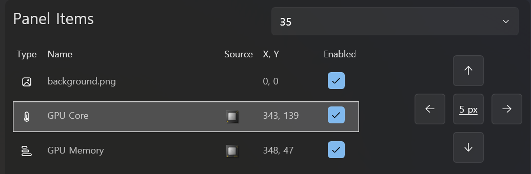 패널 아이템 목록의 순서를 바꾸거나 복사, X, Y 좌표 값을 변경할 수 있다.