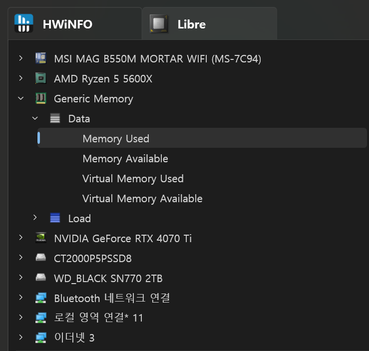 HWiNFO 와 Libre에서 모니터 할 항목을 선택할 수 있다.