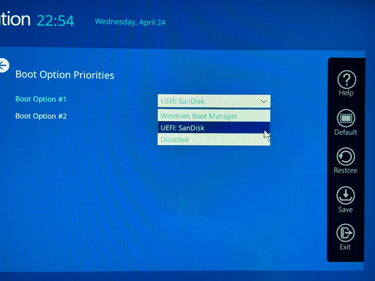 부팅 순서 Boot Option 1을 USB로 선택하고 오른쪽 아래 Save 클릭