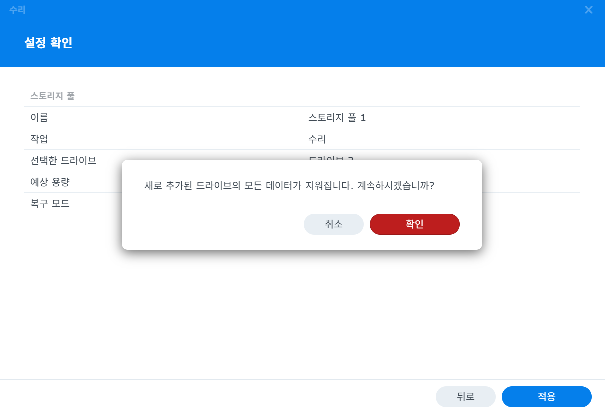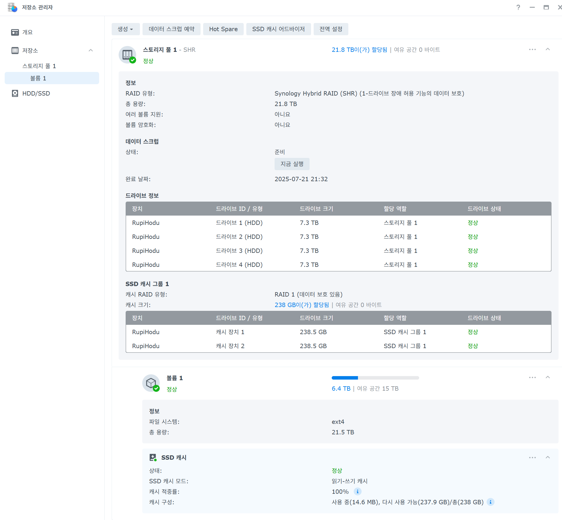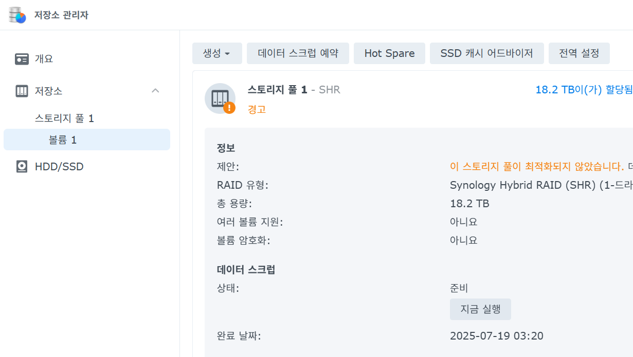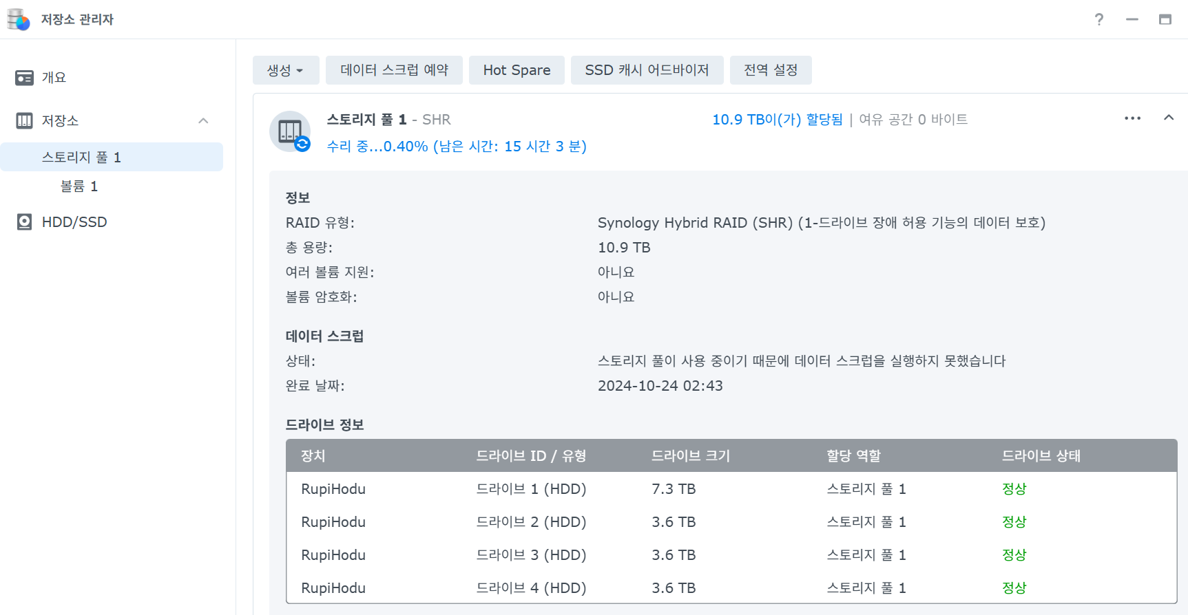 RAID 유형은 SHR 1(디스크 하나 불량 시 데이터 복구 가능, 디스크 하나의 용량은 복구용으로 사용됨)