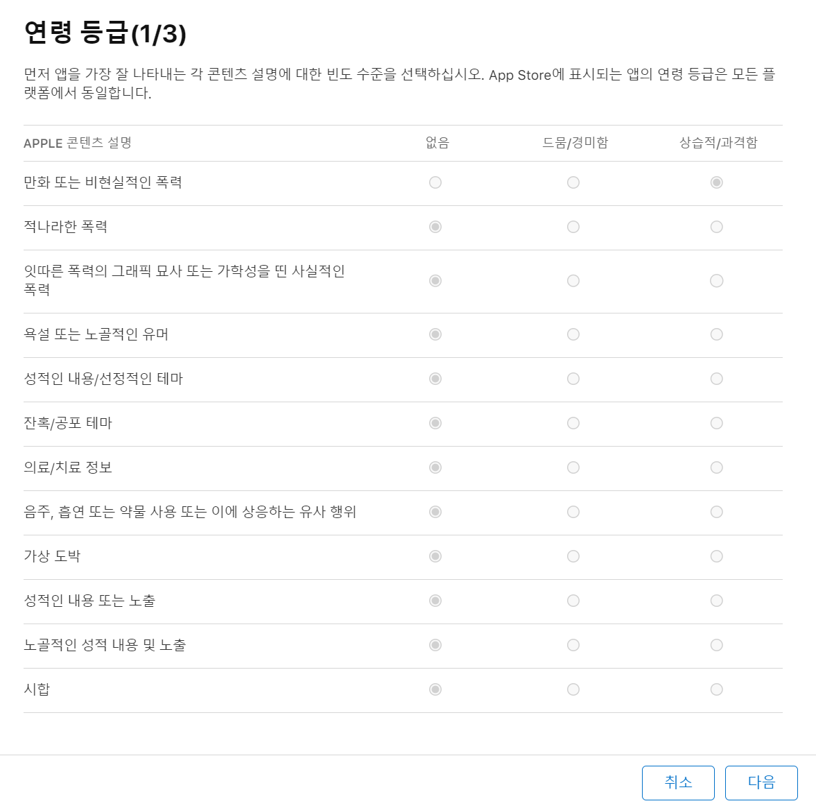 애플 앱 등록 시 만화 또는 비현실적인 폭력을 상습적/과격함을 선택했더니 12세 이상이 되었다.