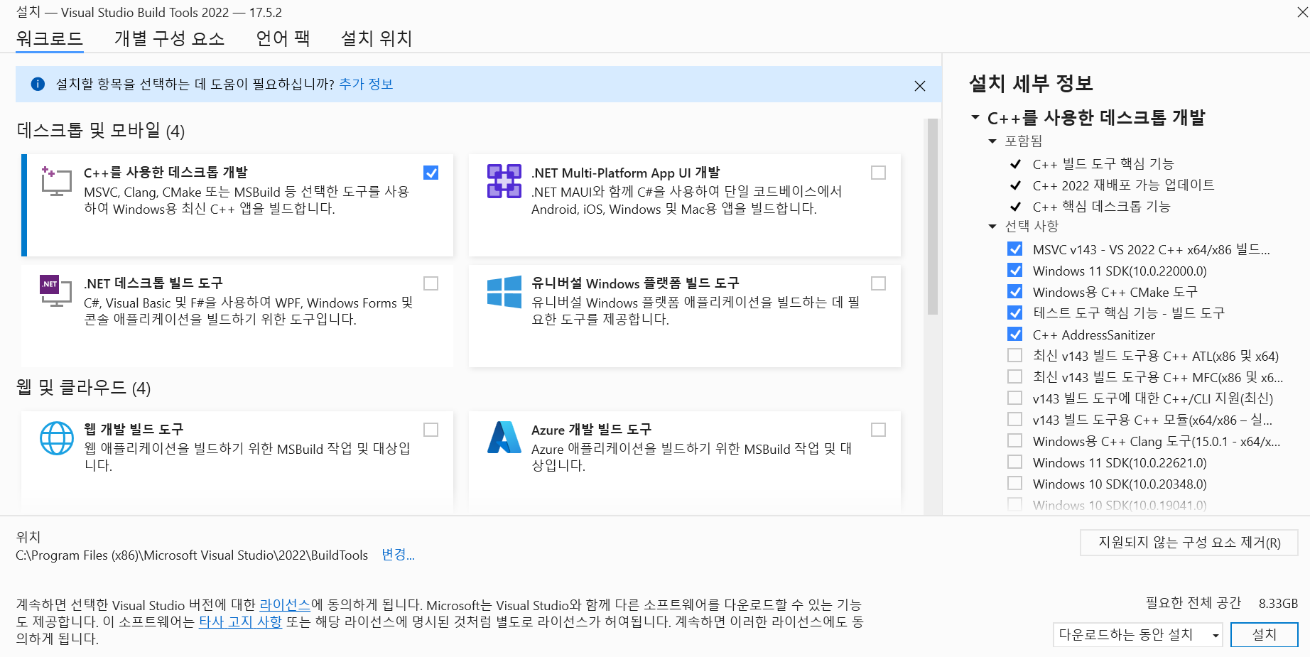 설치 시 C++을 사용한 데스크톱 개발 체크