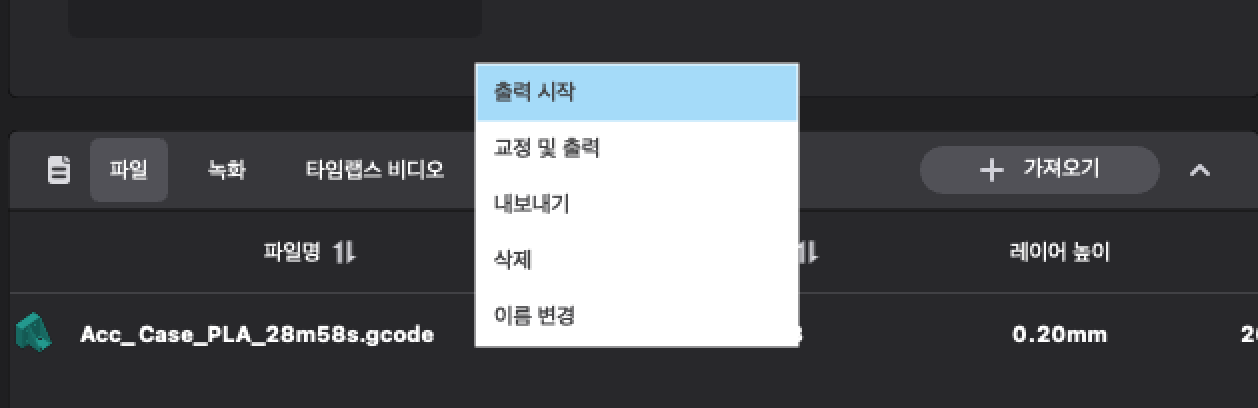 파일 - 가져오기를 통해 gcode를 하나 선택하고