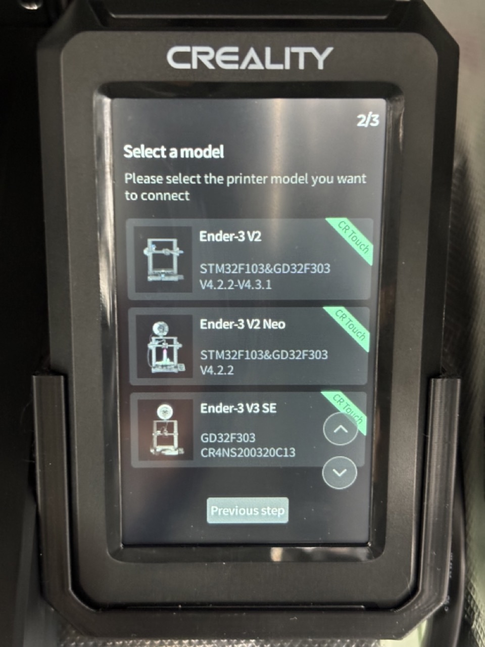 프린터기 선택 화면에서 오른쪽 아래 화살표 버튼을 눌러서 Ender-3 V3 SE 선택