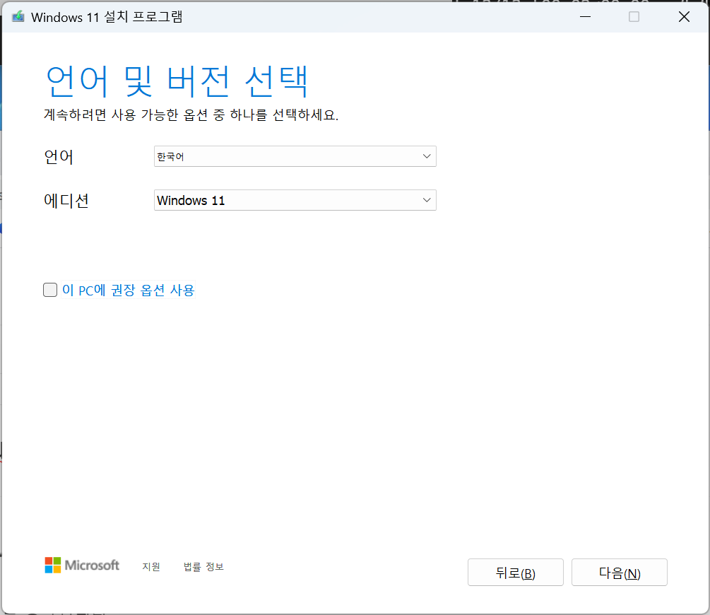 다른 PC에 설치한다면 이 PC에 권장 옵션 사용 체크 해제