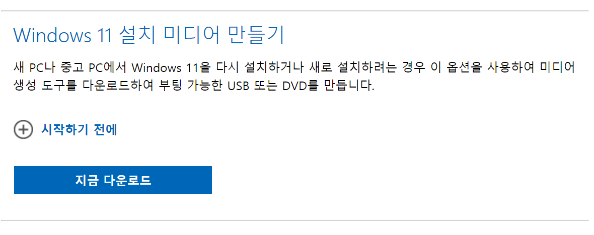설치 미디어 만들기에서 지금 다운로드 클릭하여 설치 파일 다운로드 및 실행