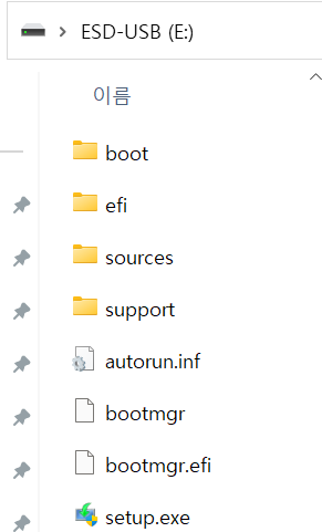 탐색기로 usb를 확인하면 윈도우 11 부팅 설치 프로그램이 깔려 있는걸 확인할 수 있다.