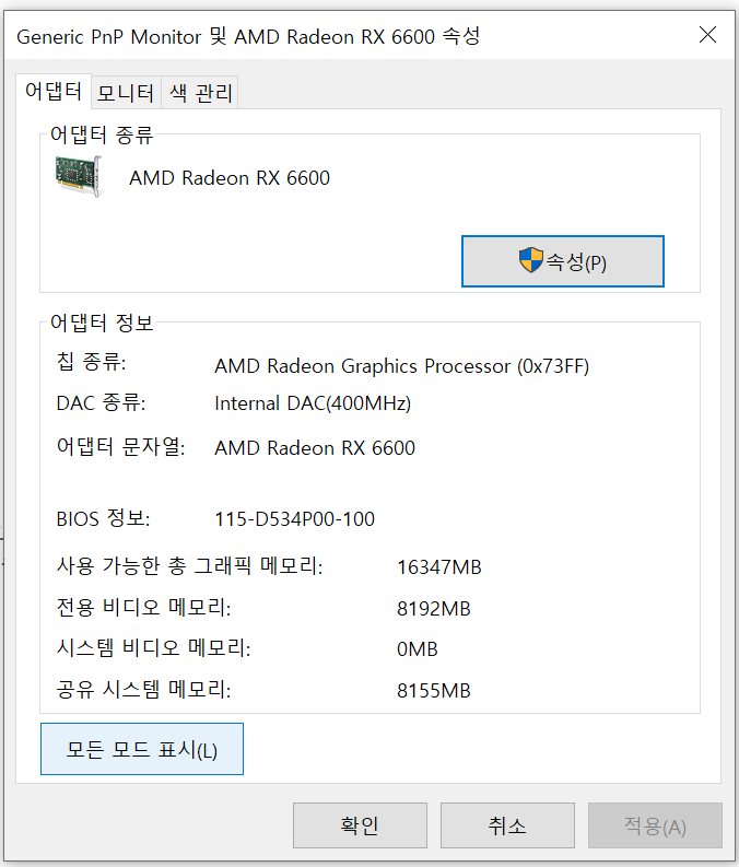 디스플레이 (x의) 어댑터 속성 표시를 클릭합니다.