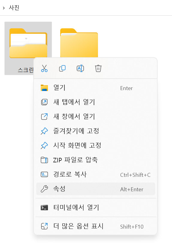 스크린샷 폴더 변경은 탐색기에서 스크린샷 폴더 마우스 우 클릭