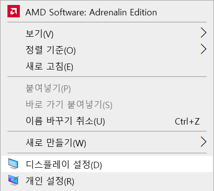 바탕화면에서 마우스 오른쪽 클릭 -> 디스플레이 설정 선택