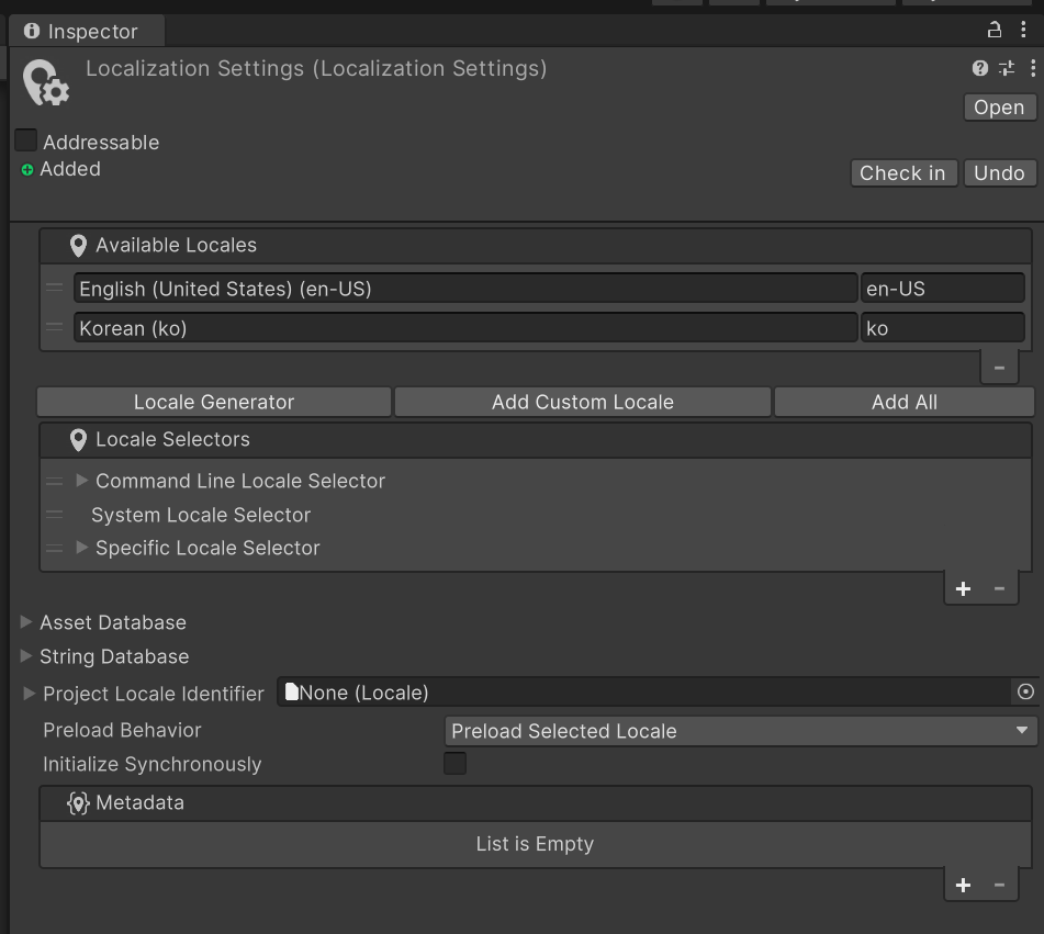인스펙터 창의 Avaliable Locales에서 추가된 언어 확인