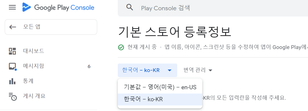Google Play Console 웹사이트의 기본 스토어 등록정보에도 동일하게 국가별 앱 이름을 추가해 준다.