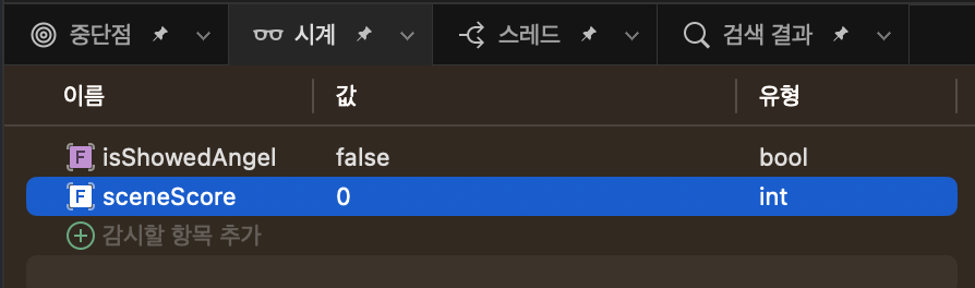 시계(Watch point, 조사식) 탭에서 추적하고자 하는 전역 변수를 기입해두면 디버깅 시 값 변화를 항상 확인할 수 있다.