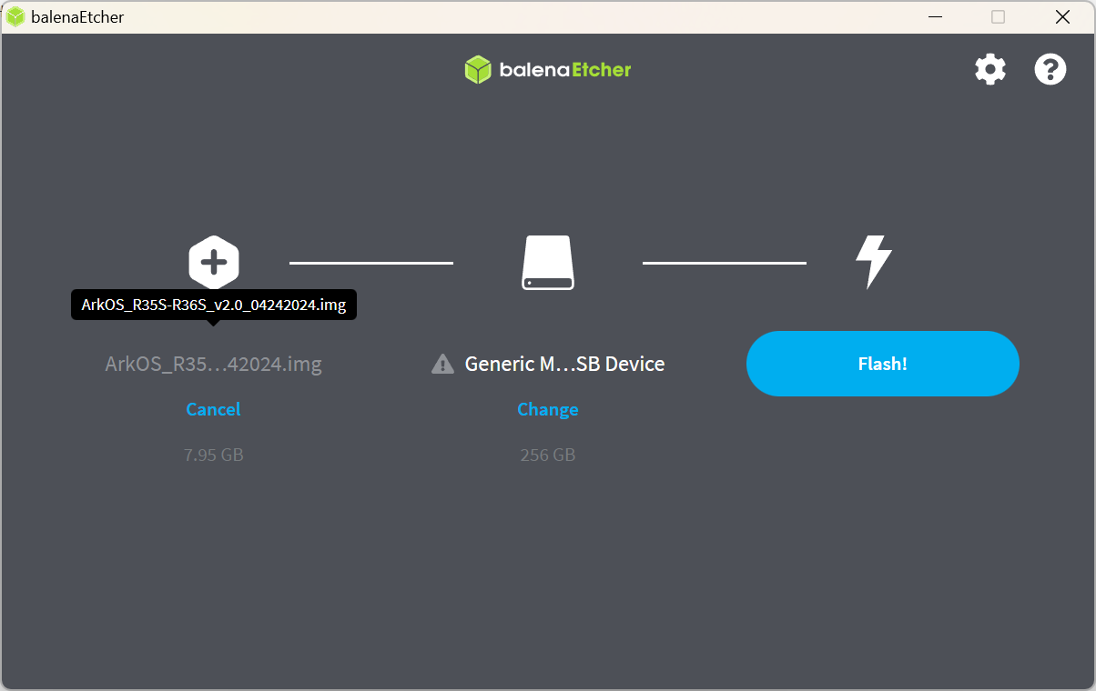 Flash from File 클릭 - 다운 받은 ArkOS 최신 Img 파일(ArkOS_R35S-R36S_v2.0_04242024.img.xz) 선택