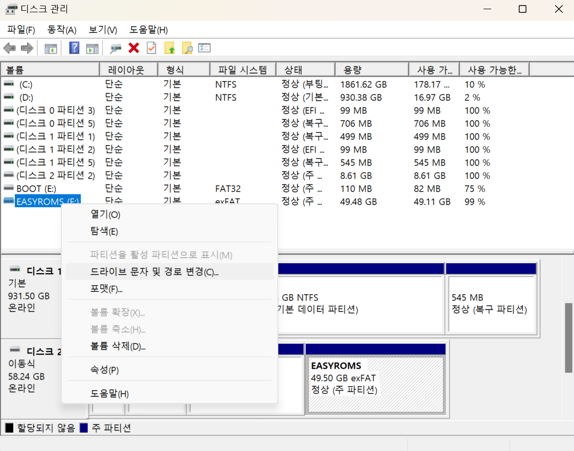 윈도우 디스크 관리를 실행하고 EASYROMS 파티션을 마우스 우클릭,