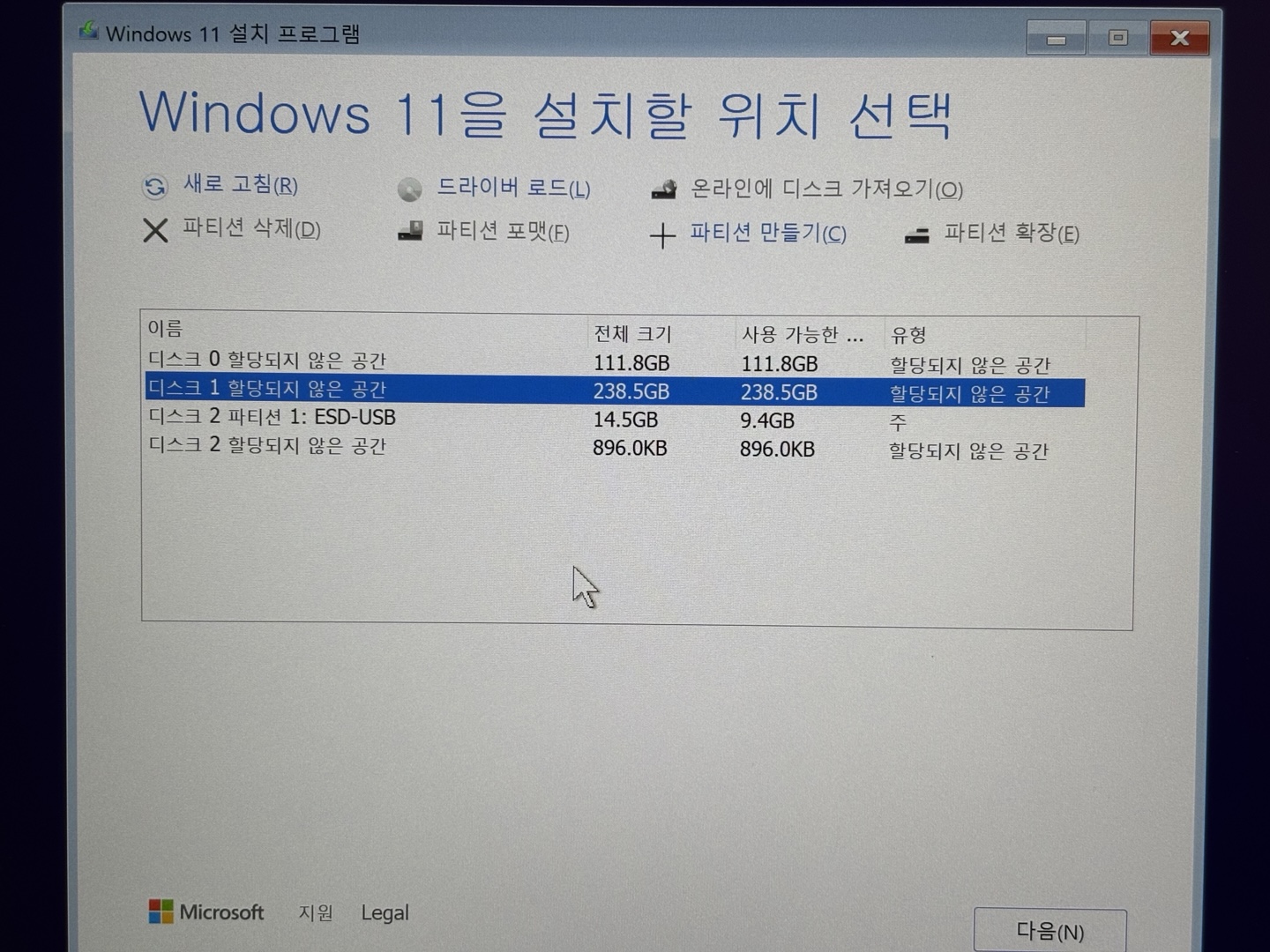 처음 켜면 윈도우11 설치 화면이 뜬다.