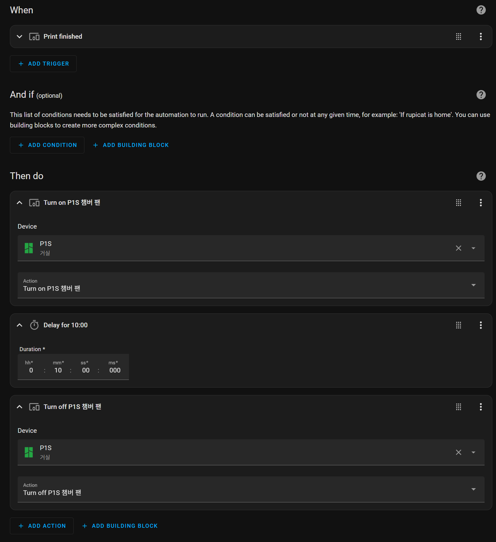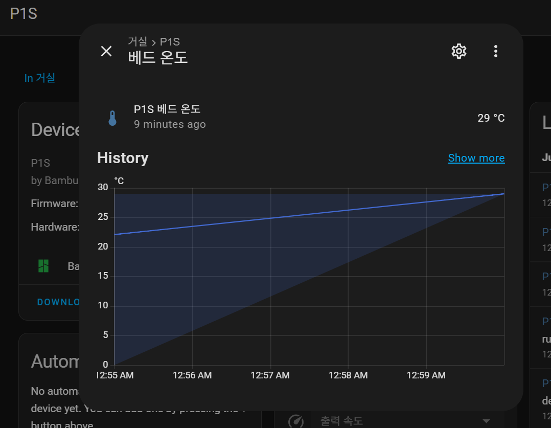 프린터 출력 실패 시 구글 네스트 허브에서 "P1S 출력 실패"라는 소리가 나오게 자동화할 수 있다.