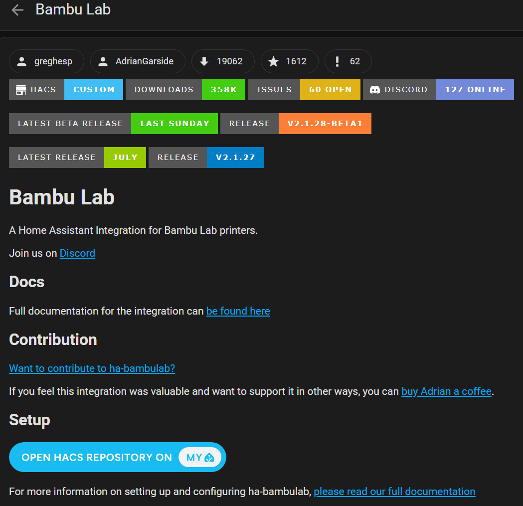 ha-bambulab Doc: https://docs.page/greghesp/ha-bambulab