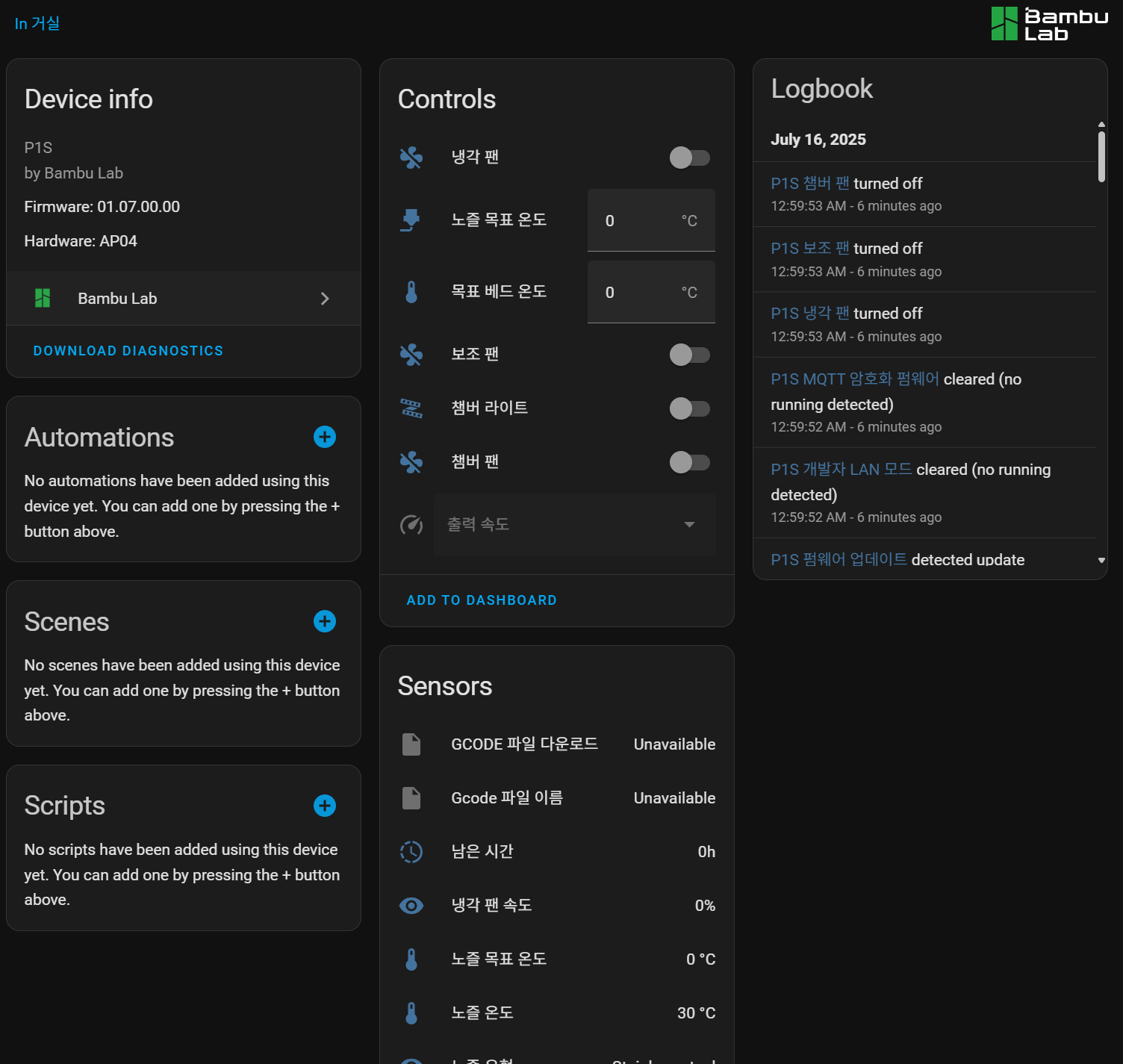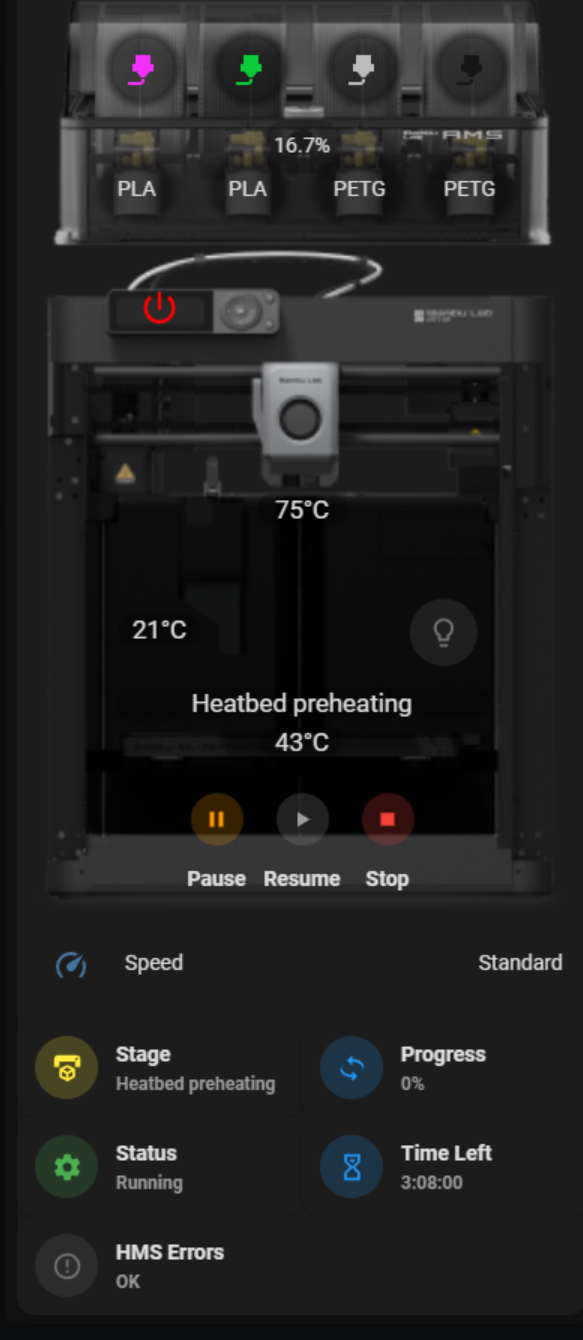 - Bambu Lab 프린터 전용 HA 카드 - 프린트 상태, 실시간 데이터, 제어 버튼 등 통합 지원 |
