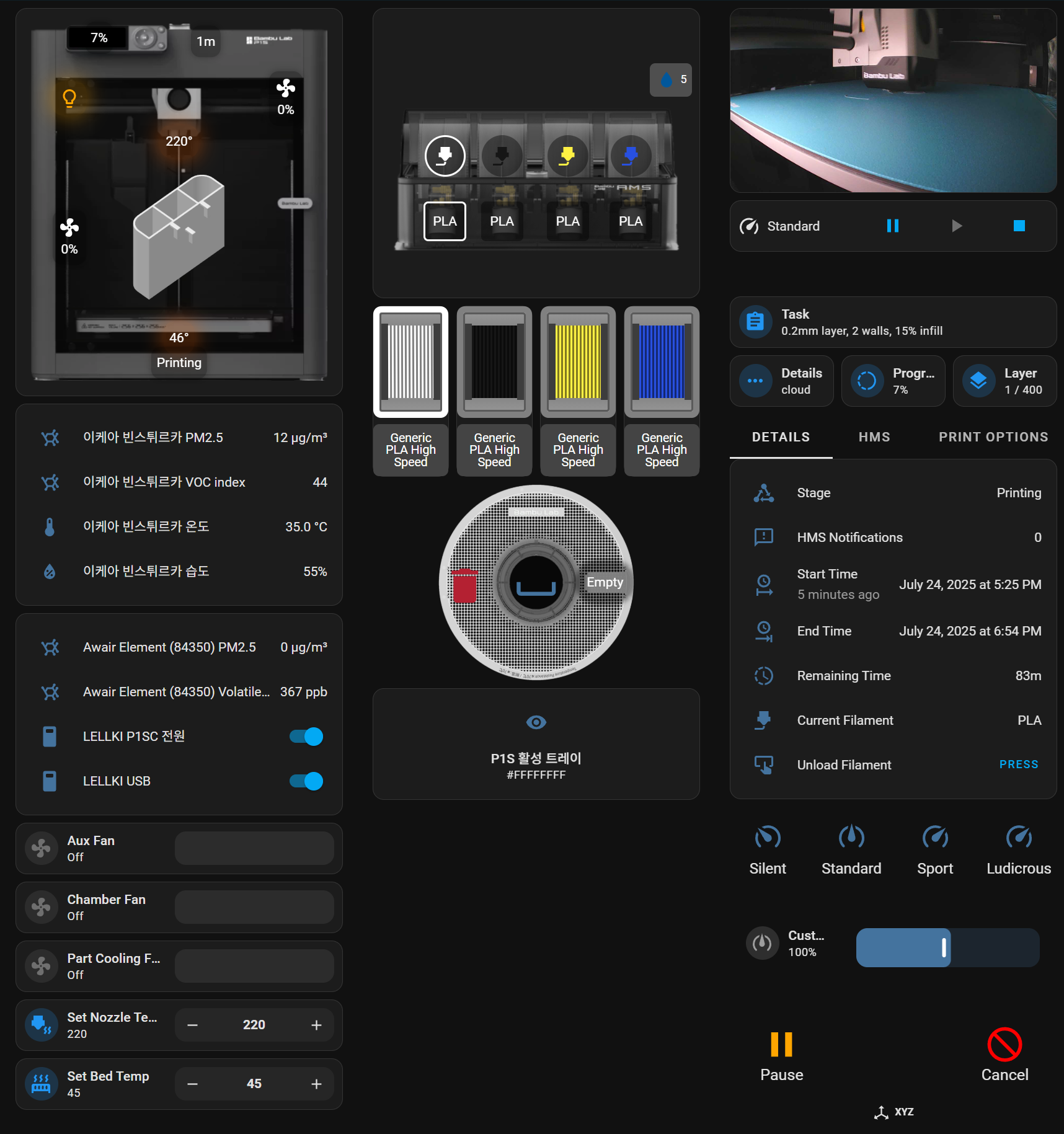 - 라이브 카메라, 진행률, 레이어, 온도 등 실시간 종합 모니터링 - AMS(재료) 상태까지 한눈에 확인 |
