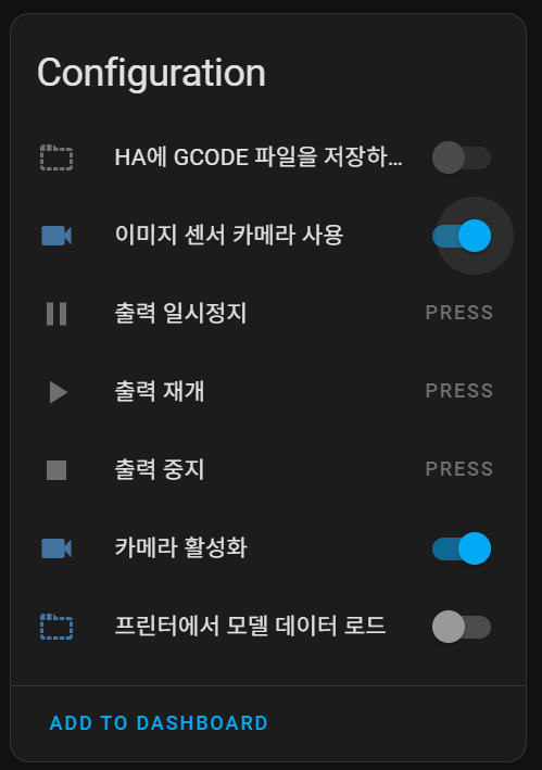 먼저 BambuLab 통합 구성요소의 P1S 엔터티의 Confuguration 항목에서 이미지 센서 카메라 사용을 On 시켜준다.