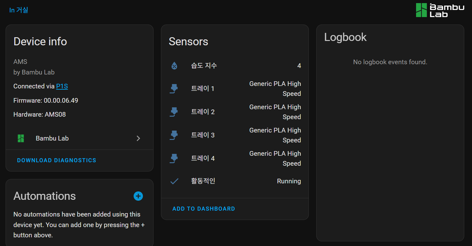 - 사용자의 프린터 및 AMS 정보를 반영하는 커스텀 YAML 카드 제작 - 미니멀한 스타일, 심플 구성 |