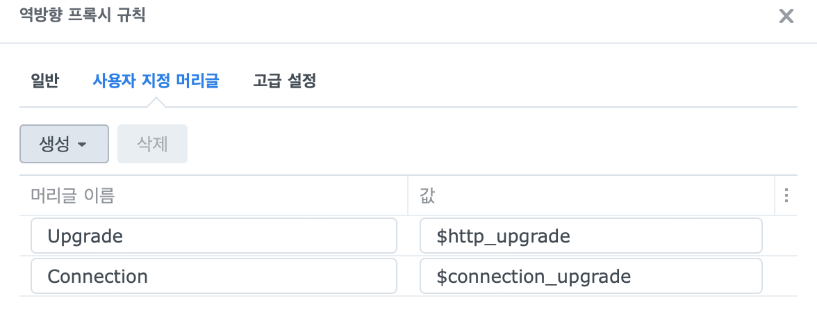 시놀로지 DSM에서 제어판 - 로그인 포털 - 고급 - 역방향 프록시 - 생성