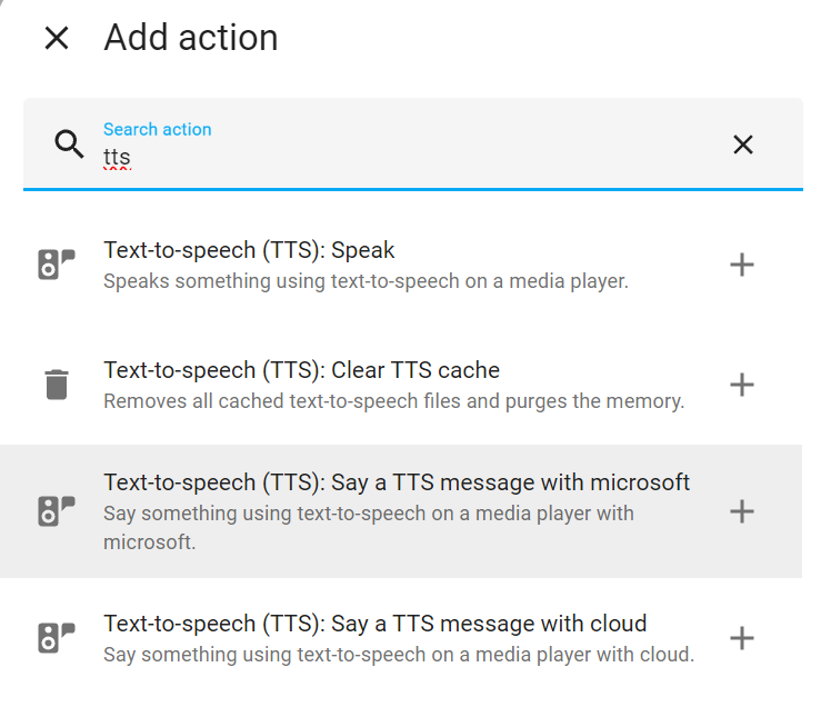 자동화 구성 시 tts 로 검색하면 ms tts를 선택할 수 있다.