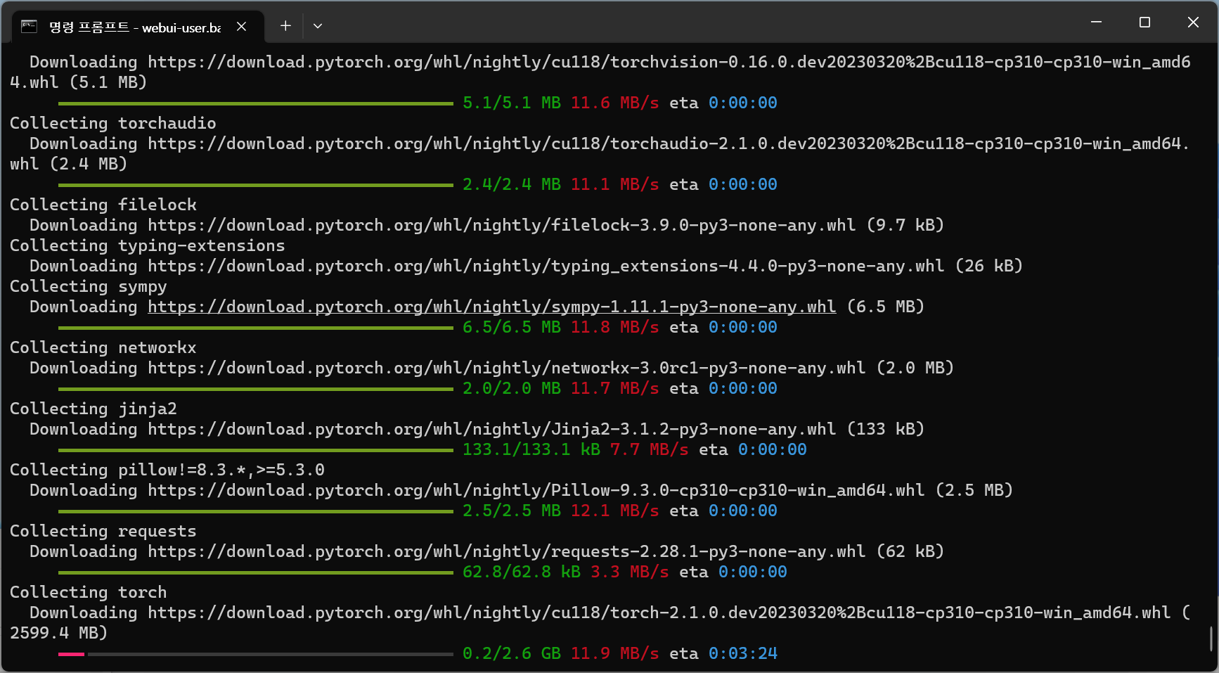 *set TORCH_COMMAND=pip install 라인은 설치가 완료되면 제거한다.