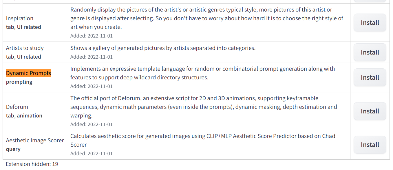 WebUI 화면의 Extensions를 통해 Dynamic Prompts 설치 후 사용