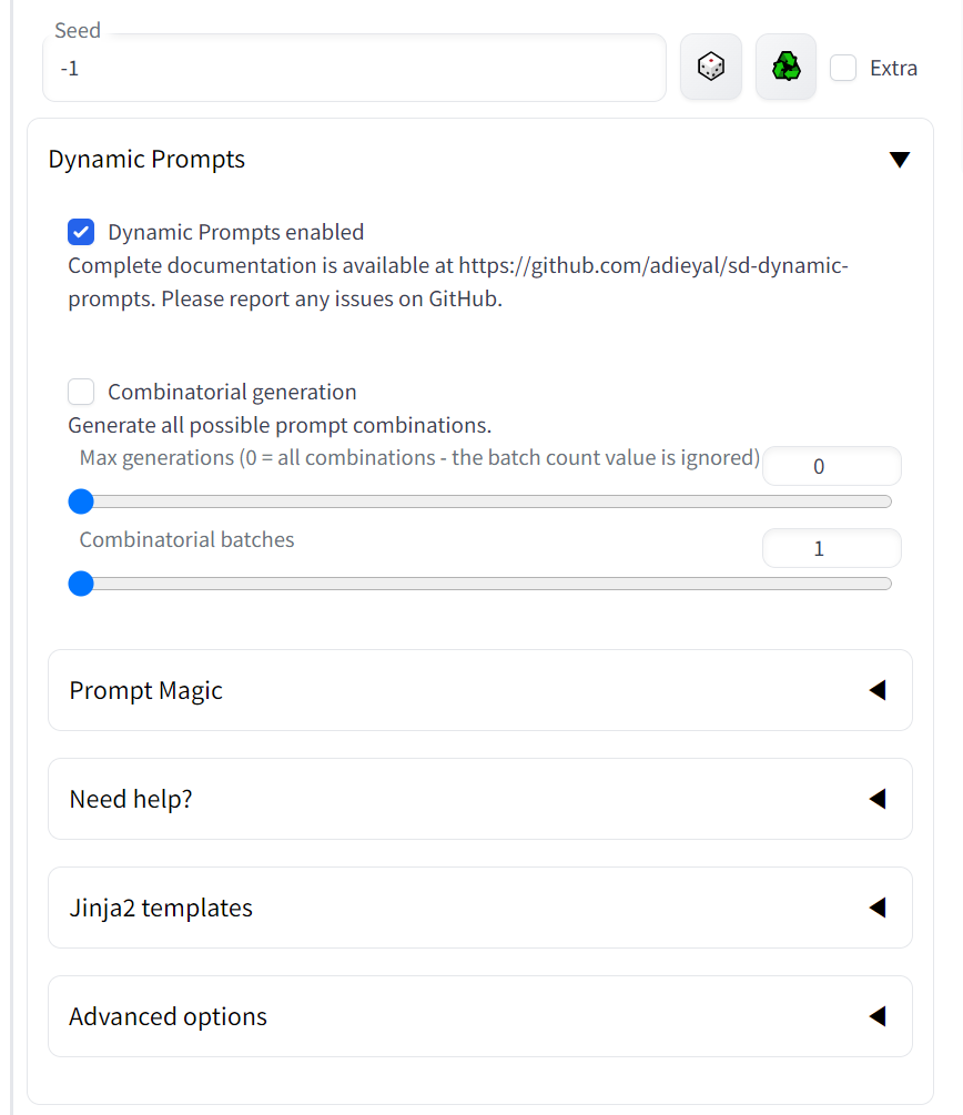 txt2img 화면에 Dynamic Promts 항목이 생성된 것을 확인