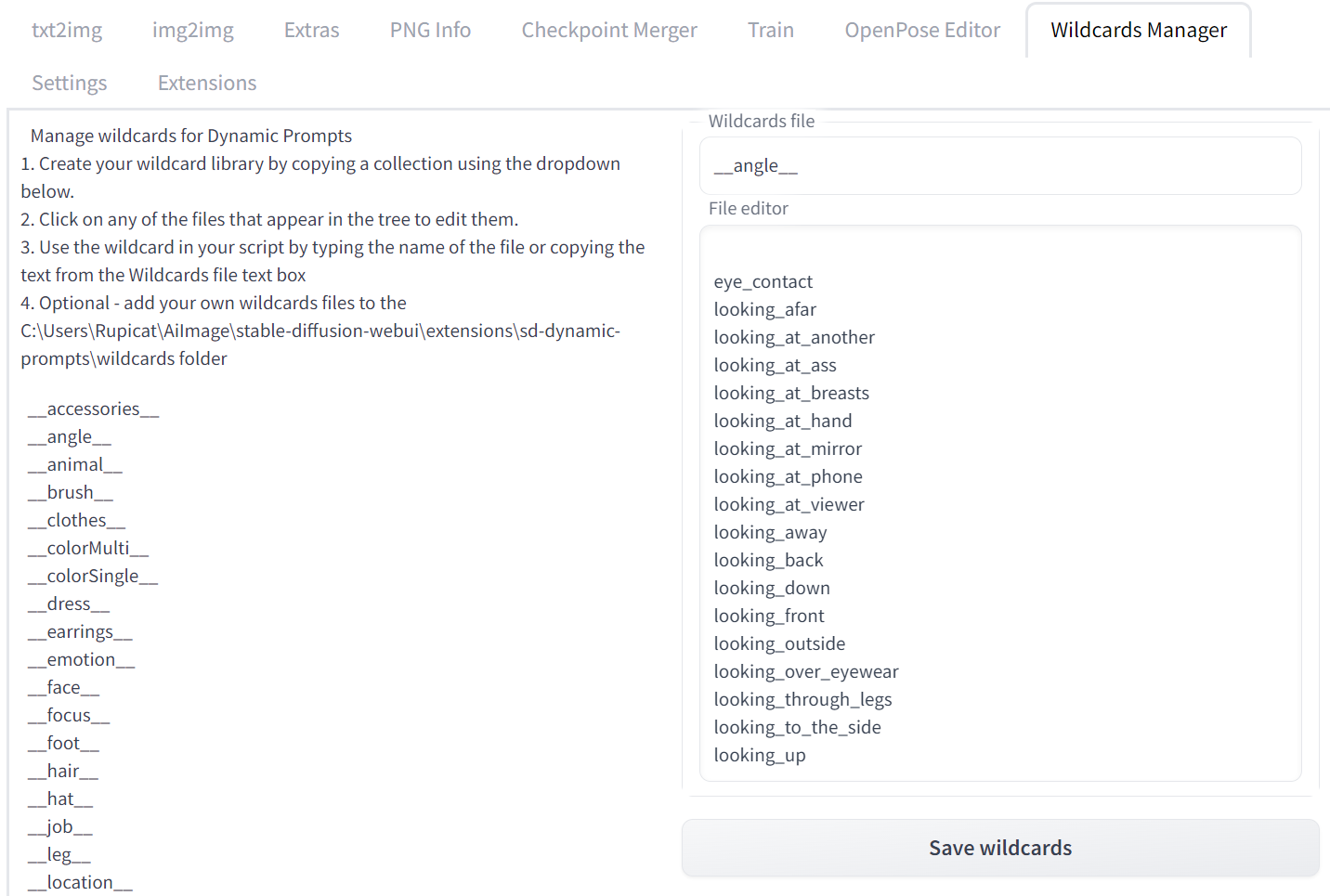 텍스트 파일을 직접 수정해도 되지만 처음 추가 후에는 Webui 확장탭(Wildcards Manager)에서 직접 확인 및 수정할 수 있다.
