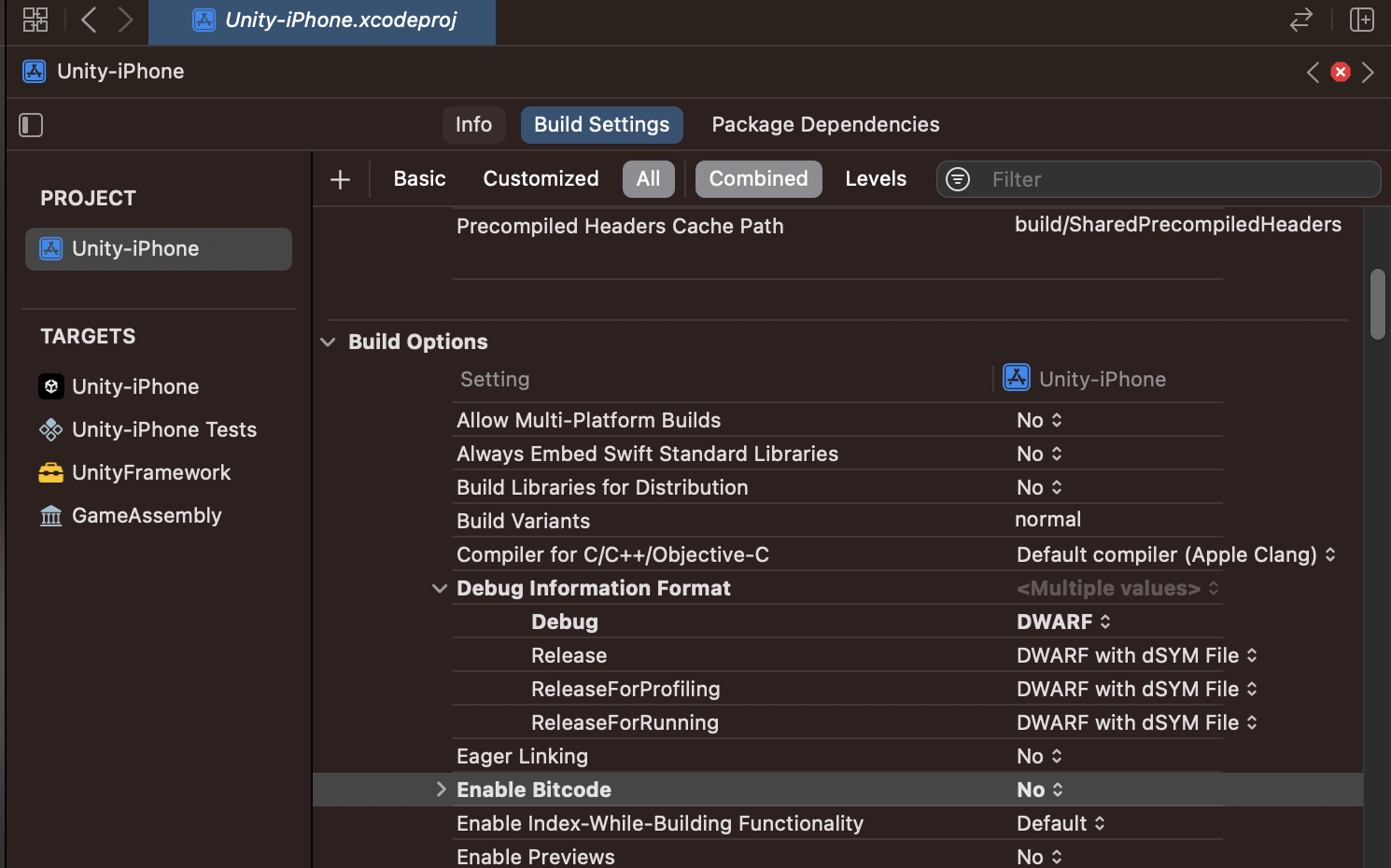 프로젝트 xcodeproj 를 선택한 상태에서 Build Settings - Build Options - Enable Bitcode를 No로 변경